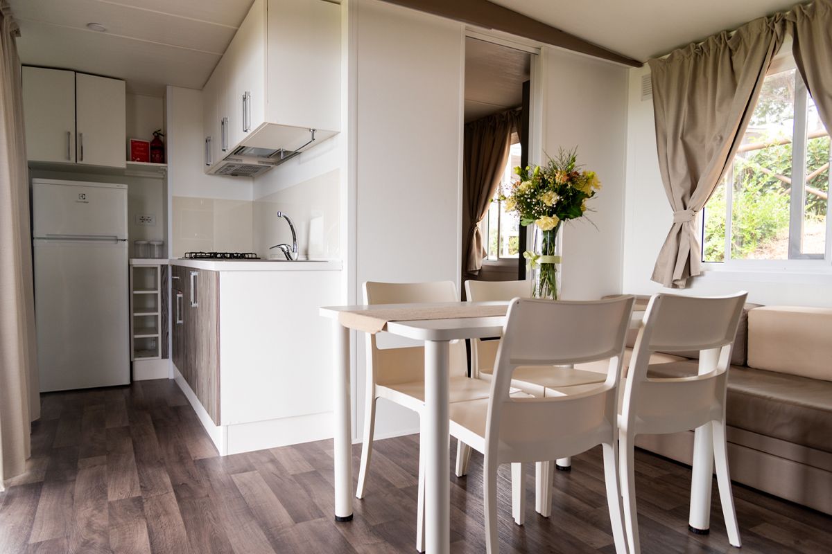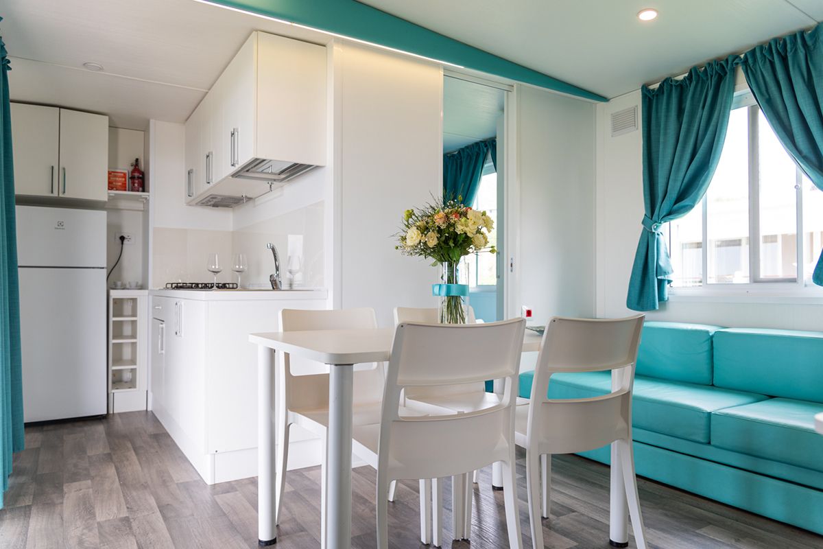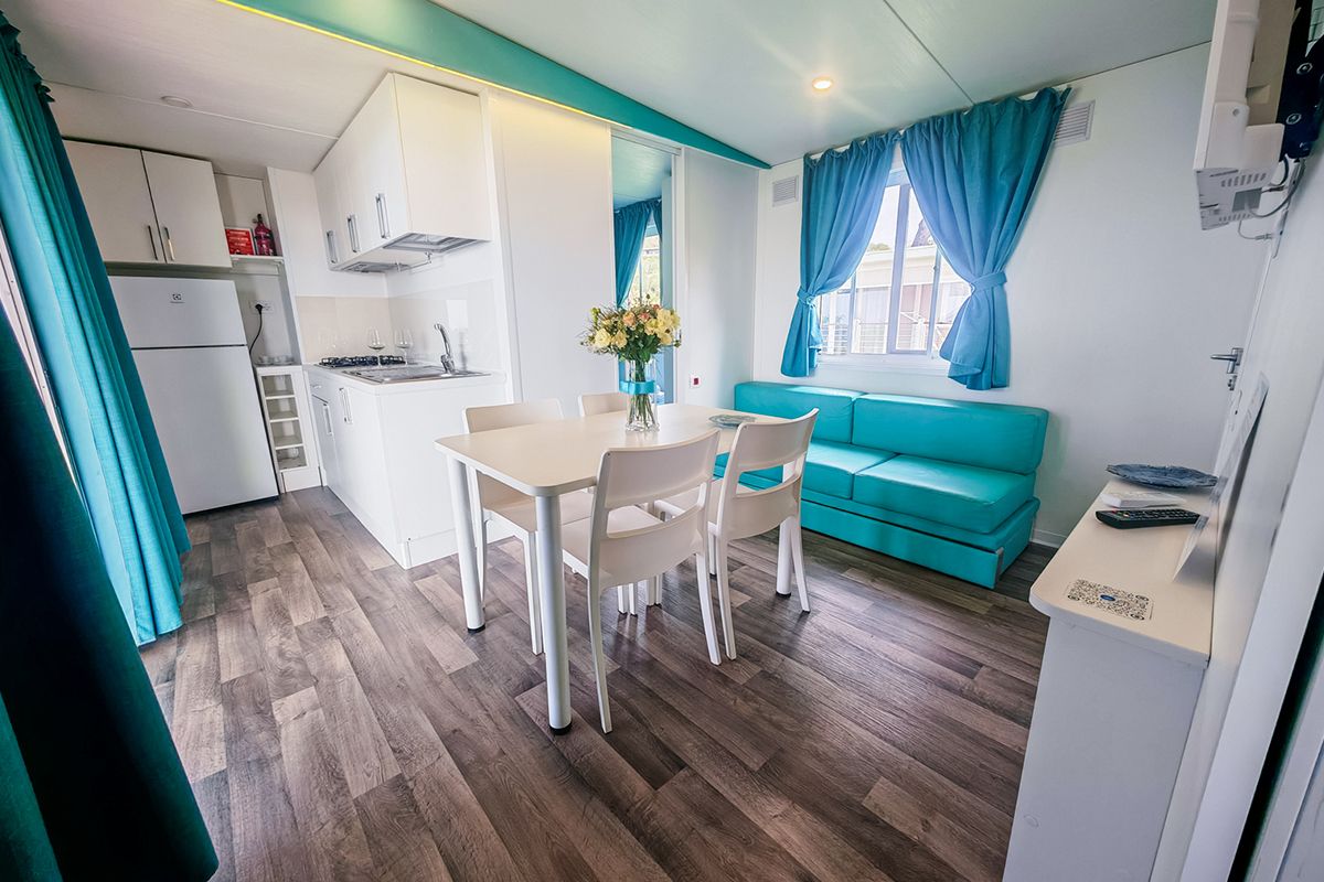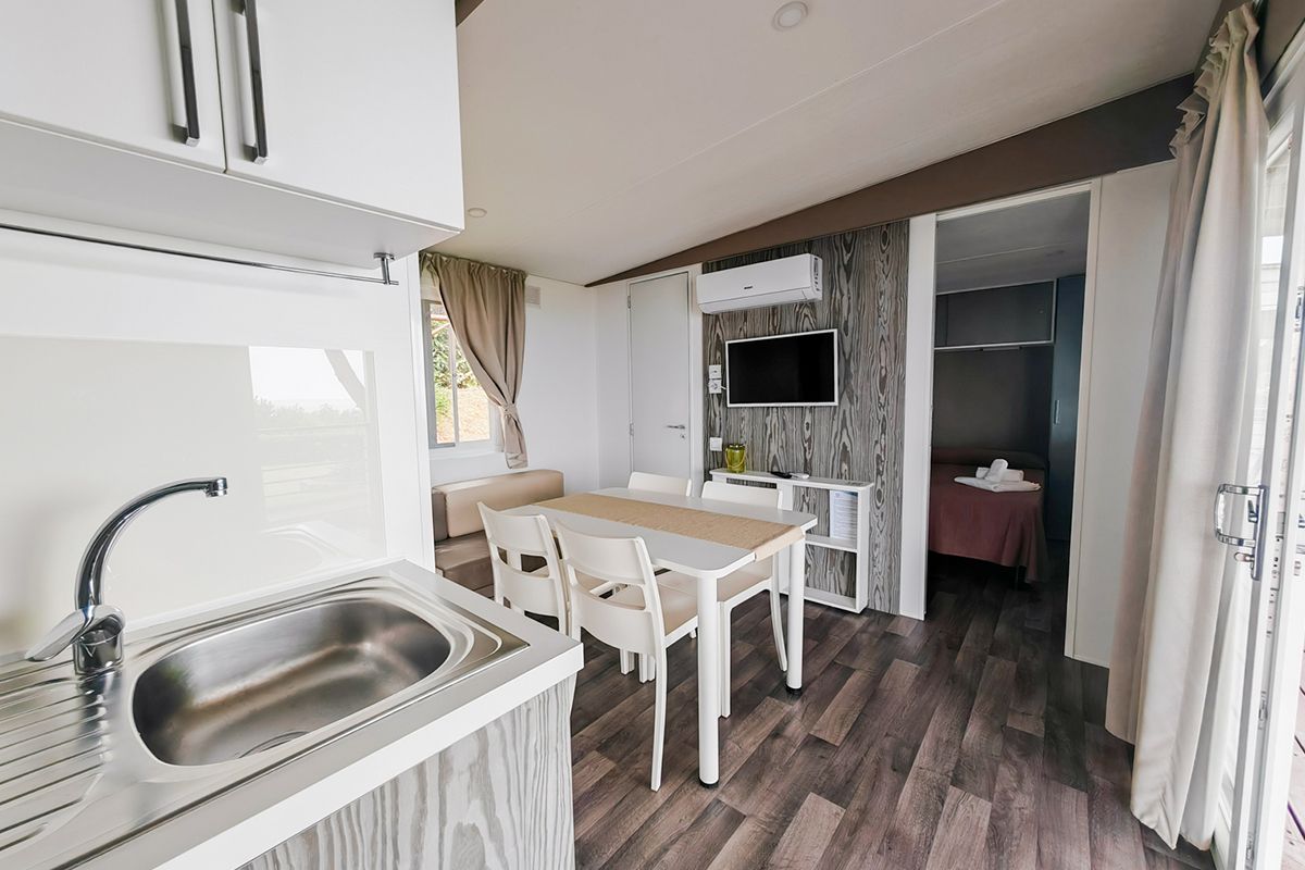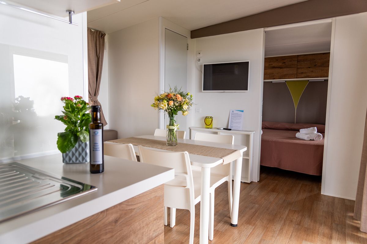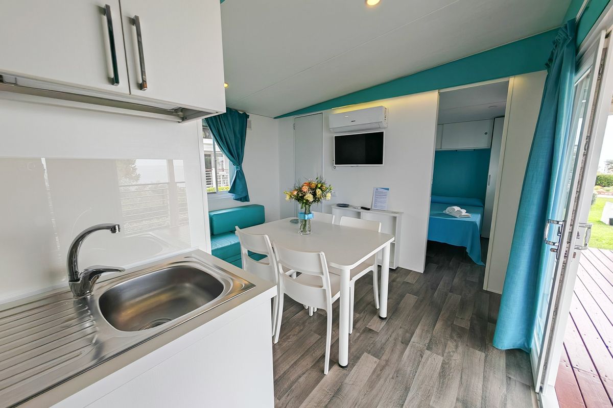 Ogni casa può ospitare fino a quattro adulti e un bambino di età non superiore ai dieci anni. Gli interni sono eleganti e accoglienti, con una camera matrimoniale, una seconda camera dotata di due lettini e un terzo letto a scomparsa, e un soggiorno luminoso dove il divano può essere trasformato in un ulteriore letto. Il bagno principale è dotato di una moderna cabina doccia cromatica, mentre alcune unità dispongono di un secondo bagno con lavabo per maggiore comodità.