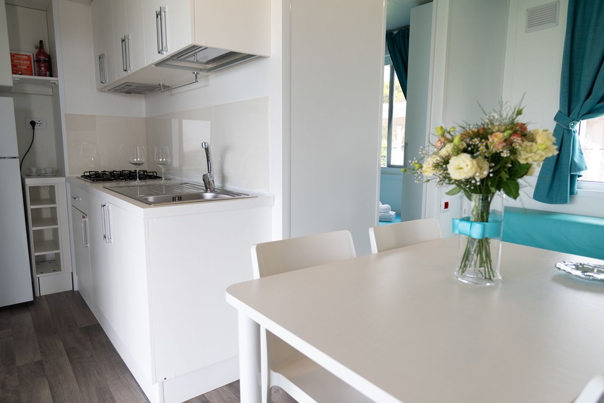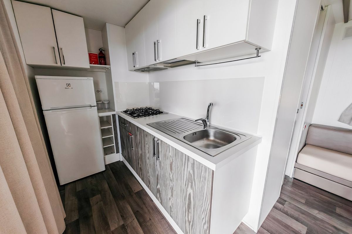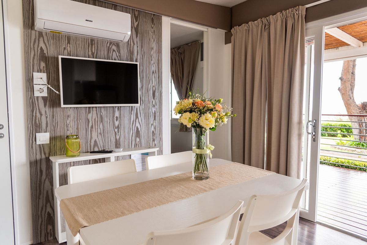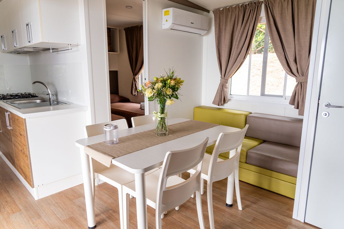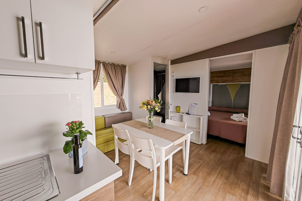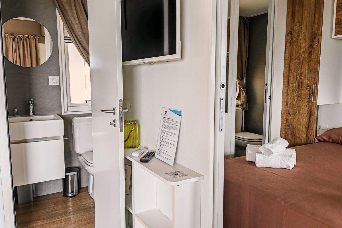 Ogni casa può ospitare fino a quattro adulti e un bambino di età non superiore ai dieci anni. Gli interni sono eleganti e accoglienti, con una camera matrimoniale, una seconda camera dotata di due lettini e un terzo letto a scomparsa, e un soggiorno luminoso dove il divano può essere trasformato in un ulteriore letto. Il bagno principale è dotato di una moderna cabina doccia cromatica, mentre alcune unità dispongono di un secondo bagno con lavabo per maggiore comodità.
